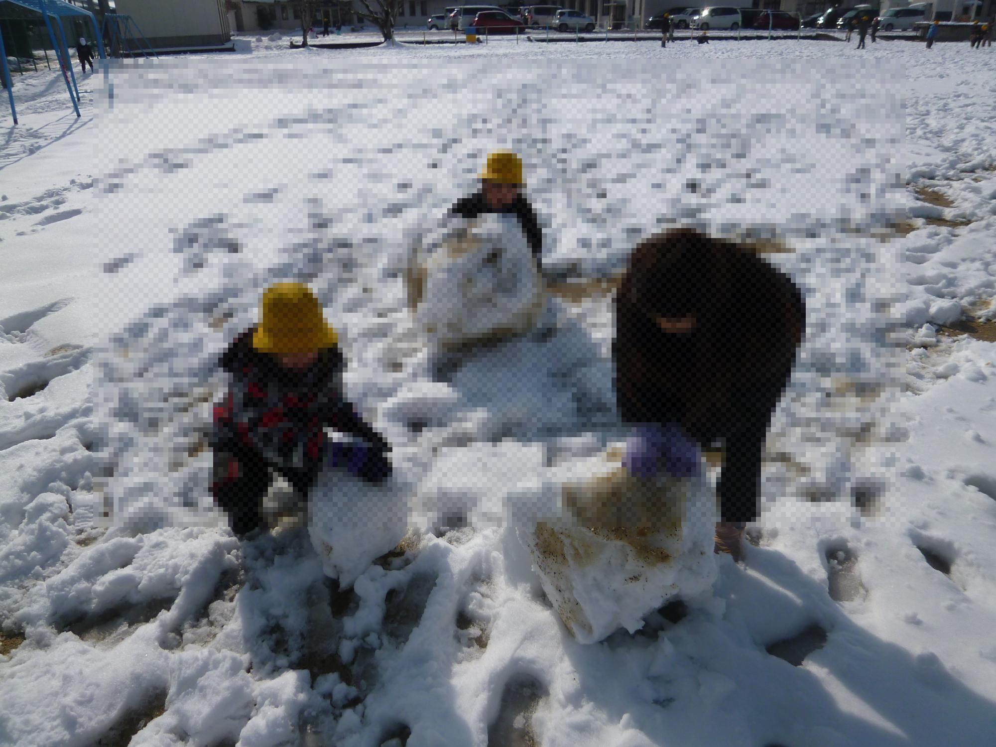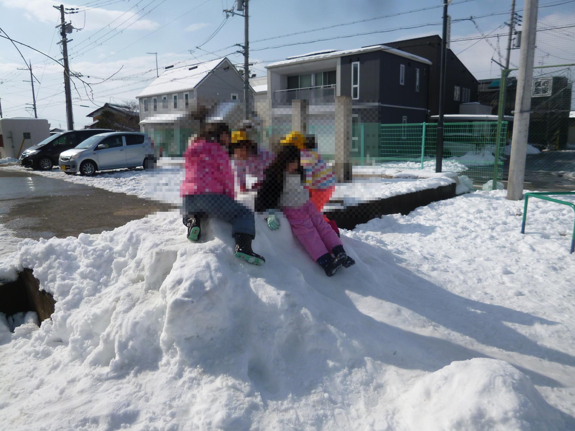 道路の雪はとけてきましたが、運動場は一面真っ白です。そんな雪が積もる運動場で、昼休みには子どもたちは元気に遊んでいました。