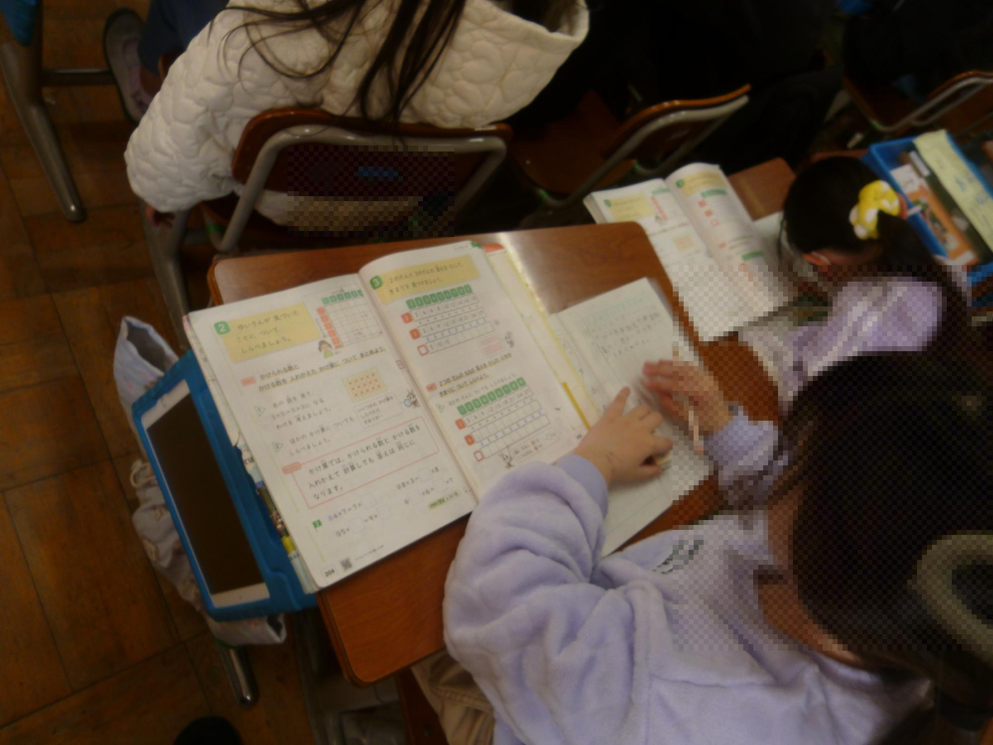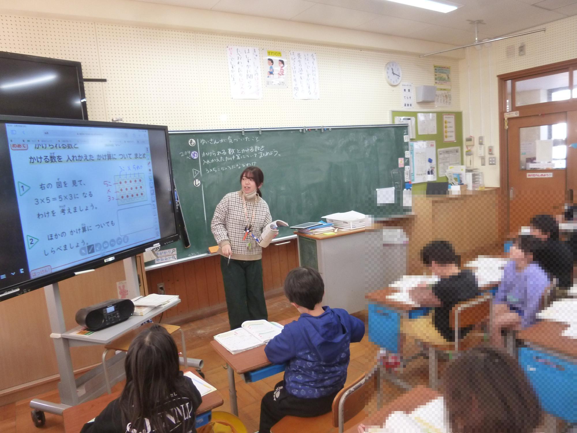 2年生の算数の授業の様子です。今、かけ算のきまりについて学習しています。今日は、3×5と5×3が同じ答えになる理由をみんなで考えていました。教科書の図を使いながら、一生懸命に説明を考える子どもたち。そして自分の考えと友達の考えを比べながら、理解を深めていました。最後に「かけられる数とかける数を入れかえても答えは同じ」ということをみんなで発見していました。