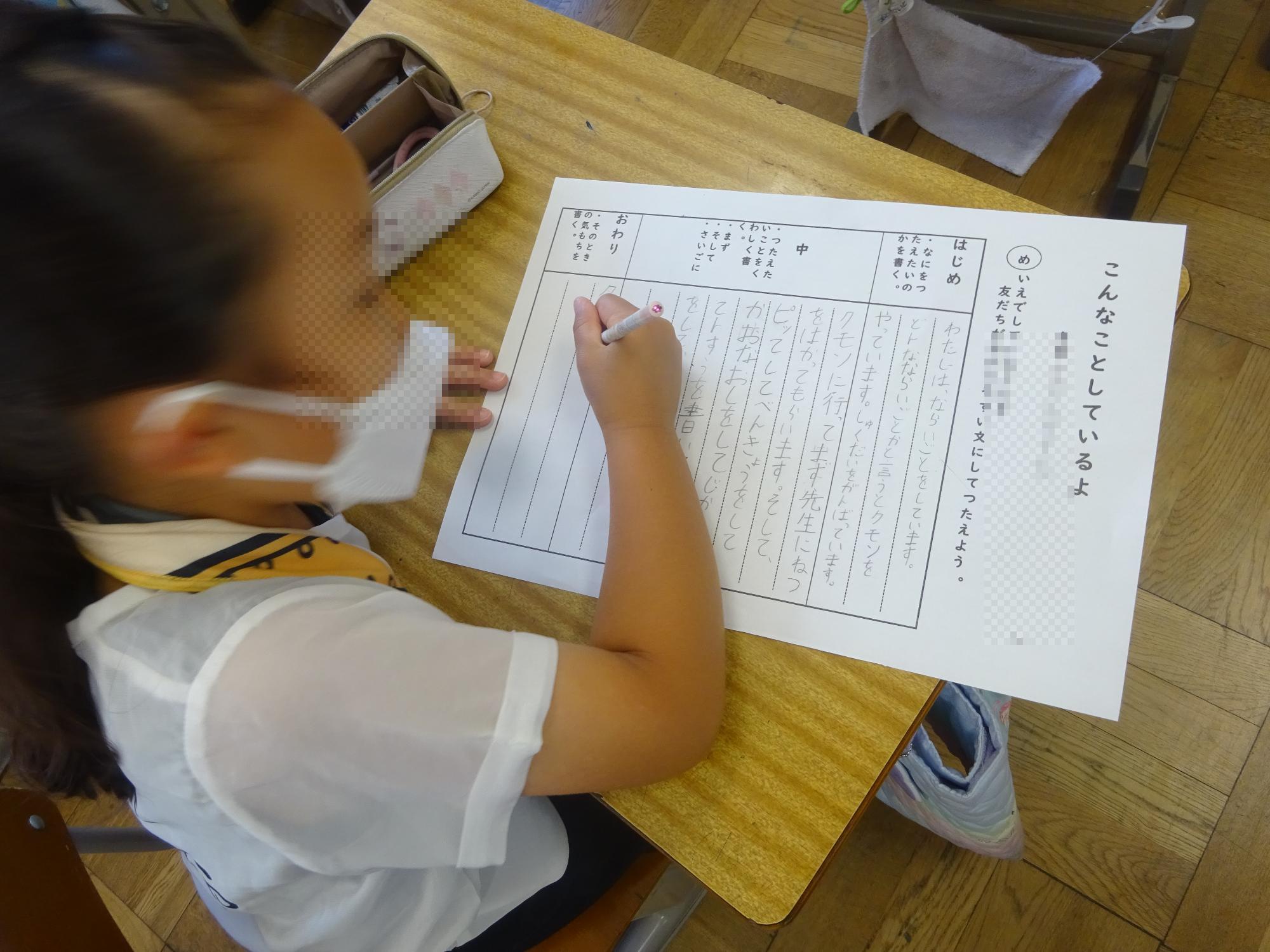 2年生、1時間目の様子です。1組、2組は国語でした。今、はじめ、中、終わりの3段構成で文章を書く学習をしています。今日は、例示された接続語を使いながら家での生活について3段構成で文章に書いていました。子どもたちは、伝えたいことを考えながら、ワークシートに順序を気を付けて意欲的に書いていました。どんな文章ができあがるのか楽しみです。3組は算数でした。今日から「かさ」の勉強が始まりました。遠く離れた先生同士で「イチゴジュースを持ち寄る」という設定でかさを比べるために大切なことをみんなで考えていました。授業では色水も登場し、子どもたちは大喜び。意欲的に考えを発表し合い、楽しく学ぶ様子の子どもたちでした。