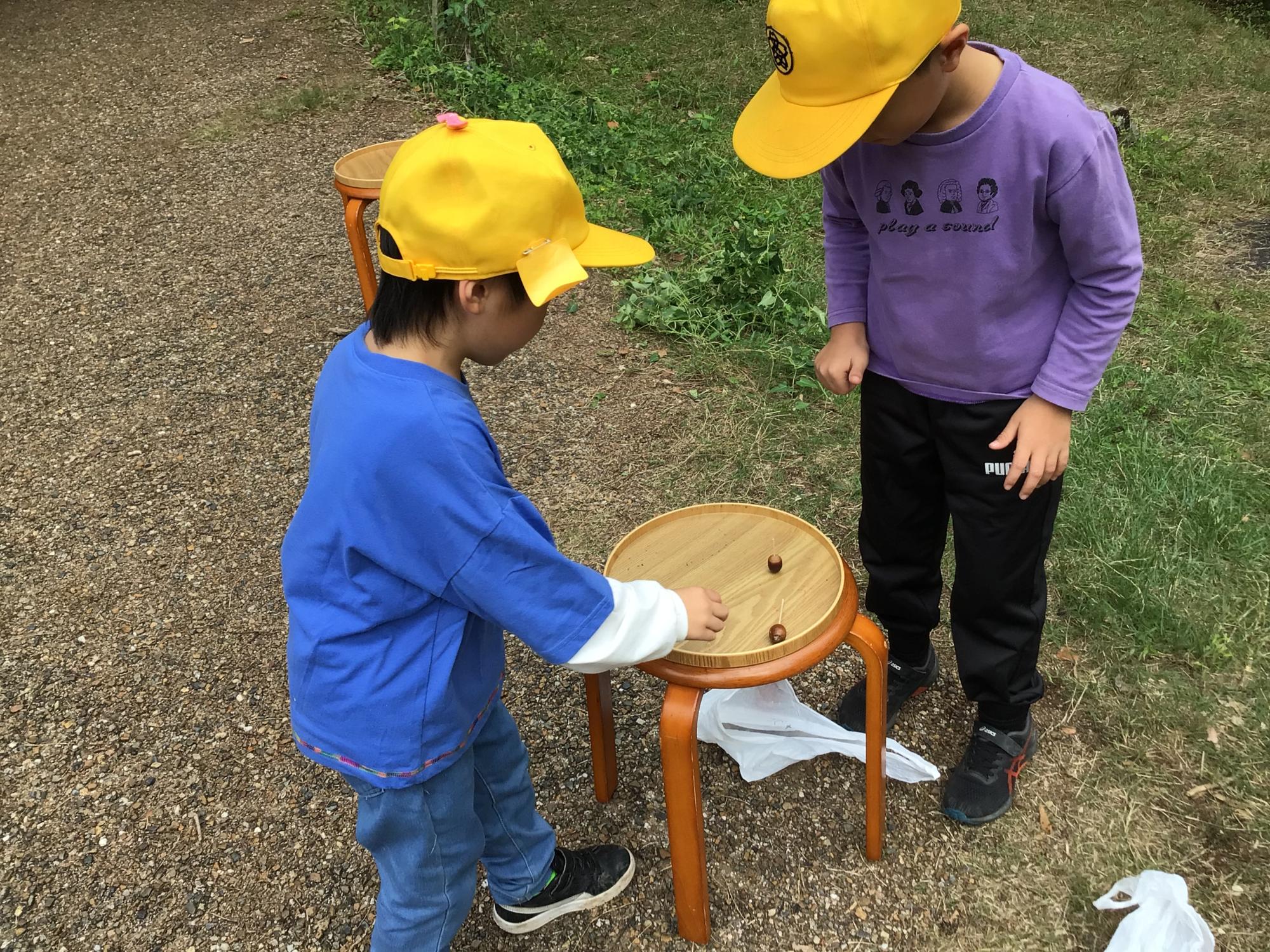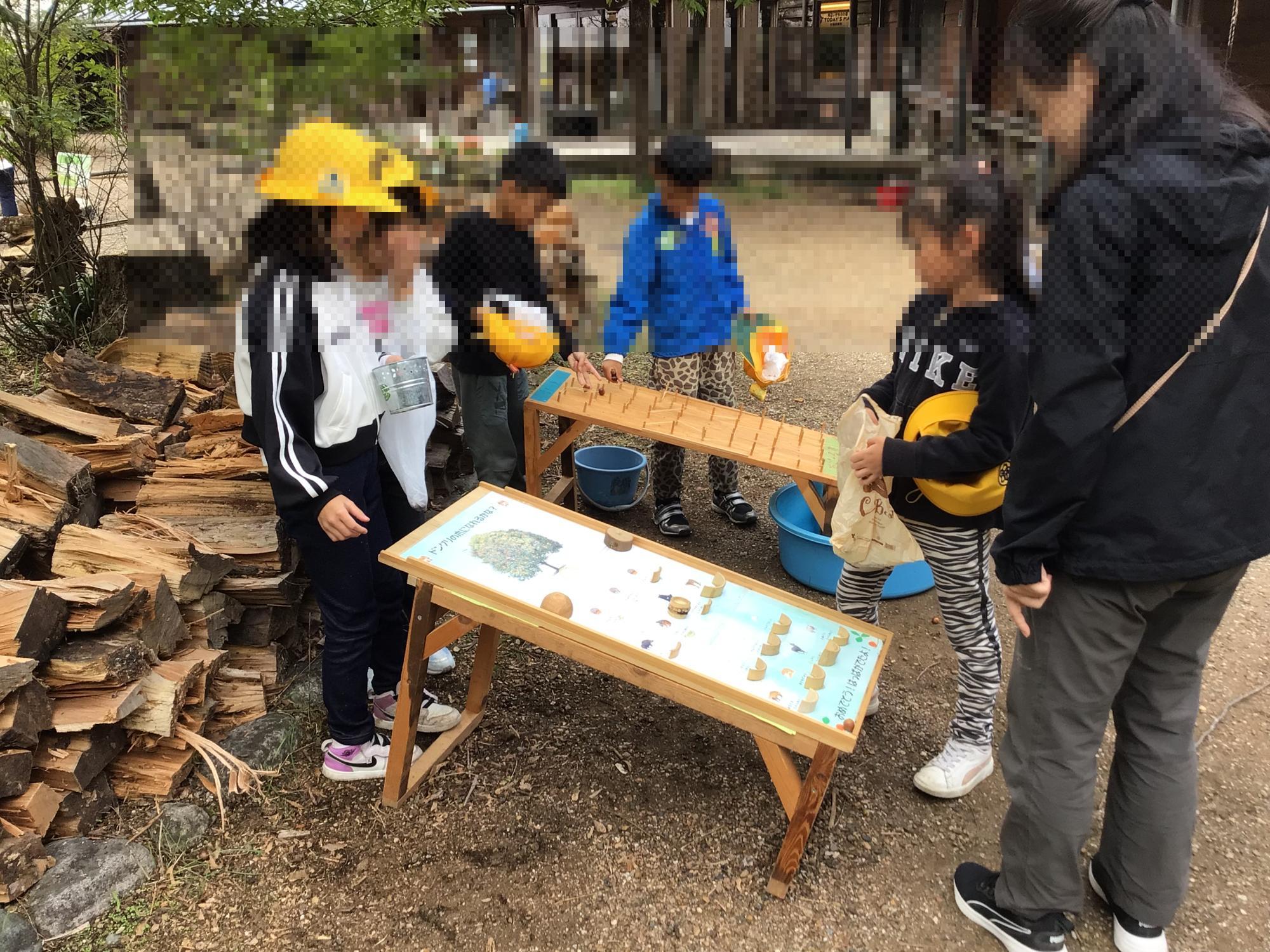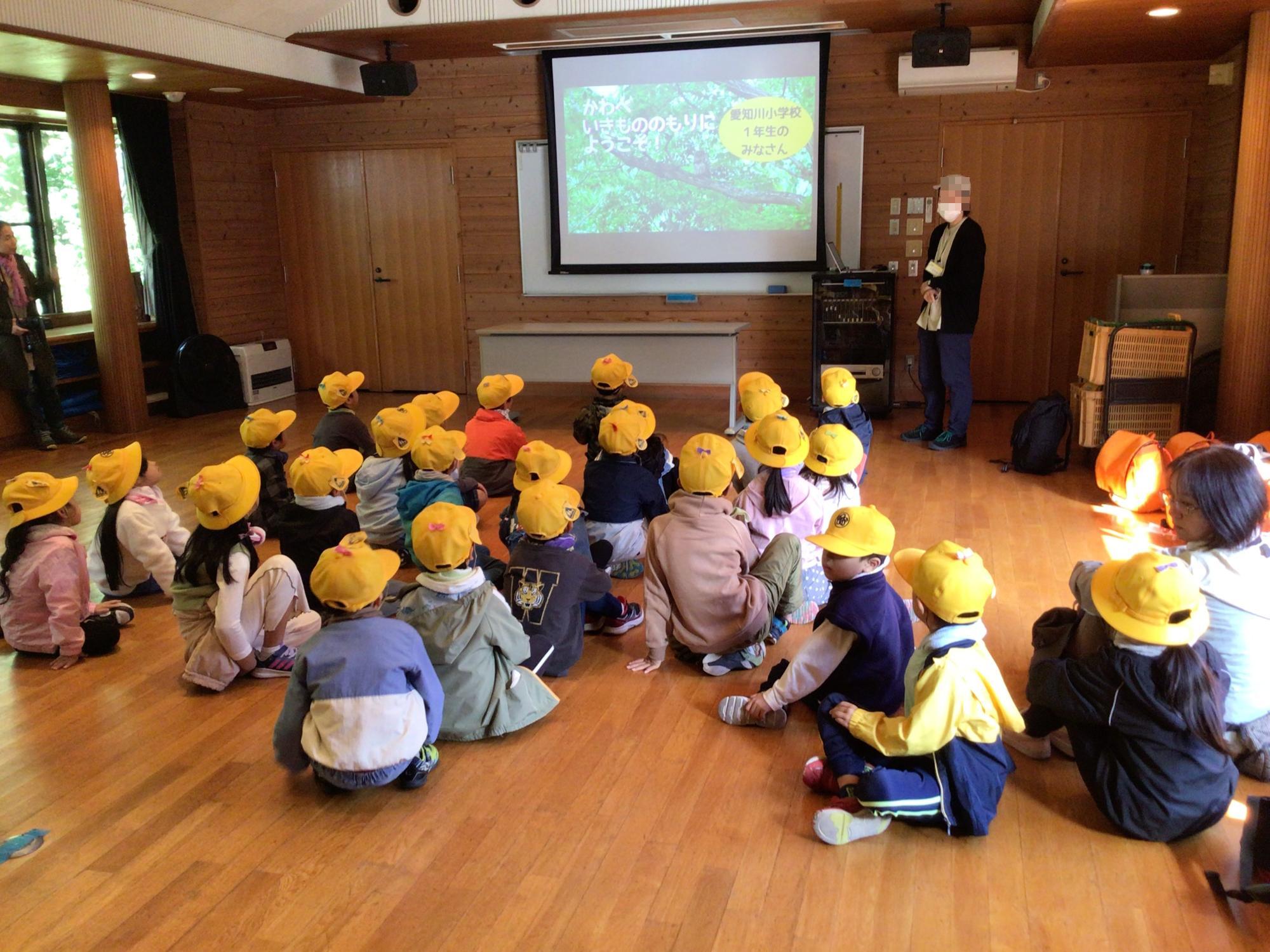 1年生は、校外学習で東近江市にある「河辺生き物の森」に出掛けました。「森の先生」と一緒に、クイズを解きながら探検をしました。どんぐりを見つけたり、木の葉で舟を作って川に浮かべたり、沢ガニを見つけたりとはじめての経験をたくさんさせていただきました。また、拾ったどんぐりで「こま」「やじろべえ」「ネックネス」などを作ってもらって遊びました。