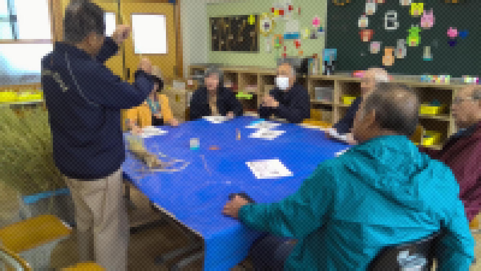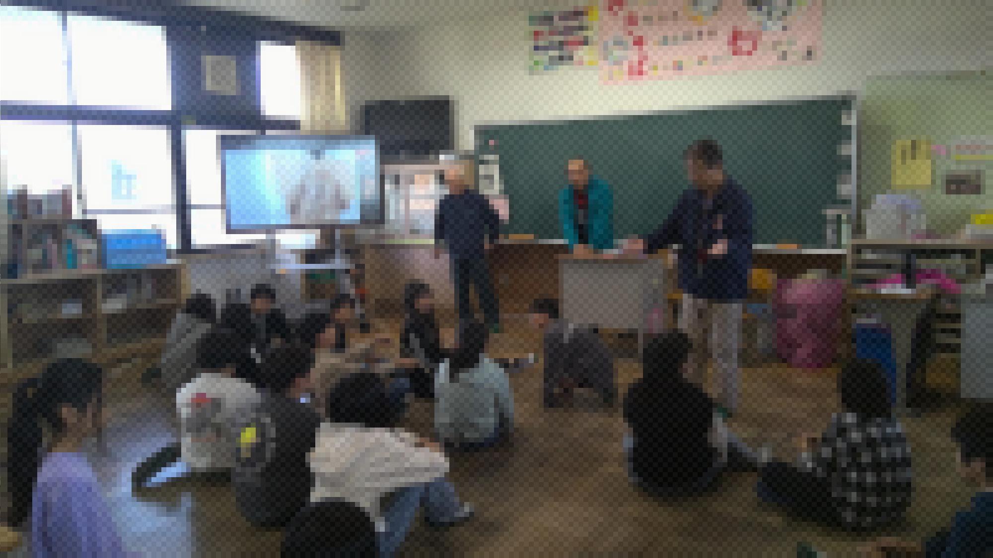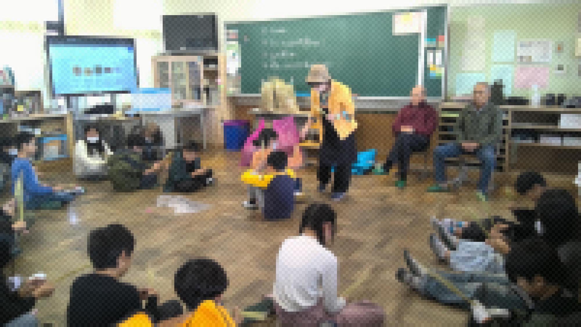 地域の方の協力のもと、5年生が収穫した米の藁を使って筆づくりに取り組みました。協力してくださった地域の方は「どうすれば子どもたちが楽しく活動できるだろう」「藁筆づくりを通してSDGsについても考えてくれればいいな」と事前に集まり、念入りに打ち合わせを行ってくださいました。