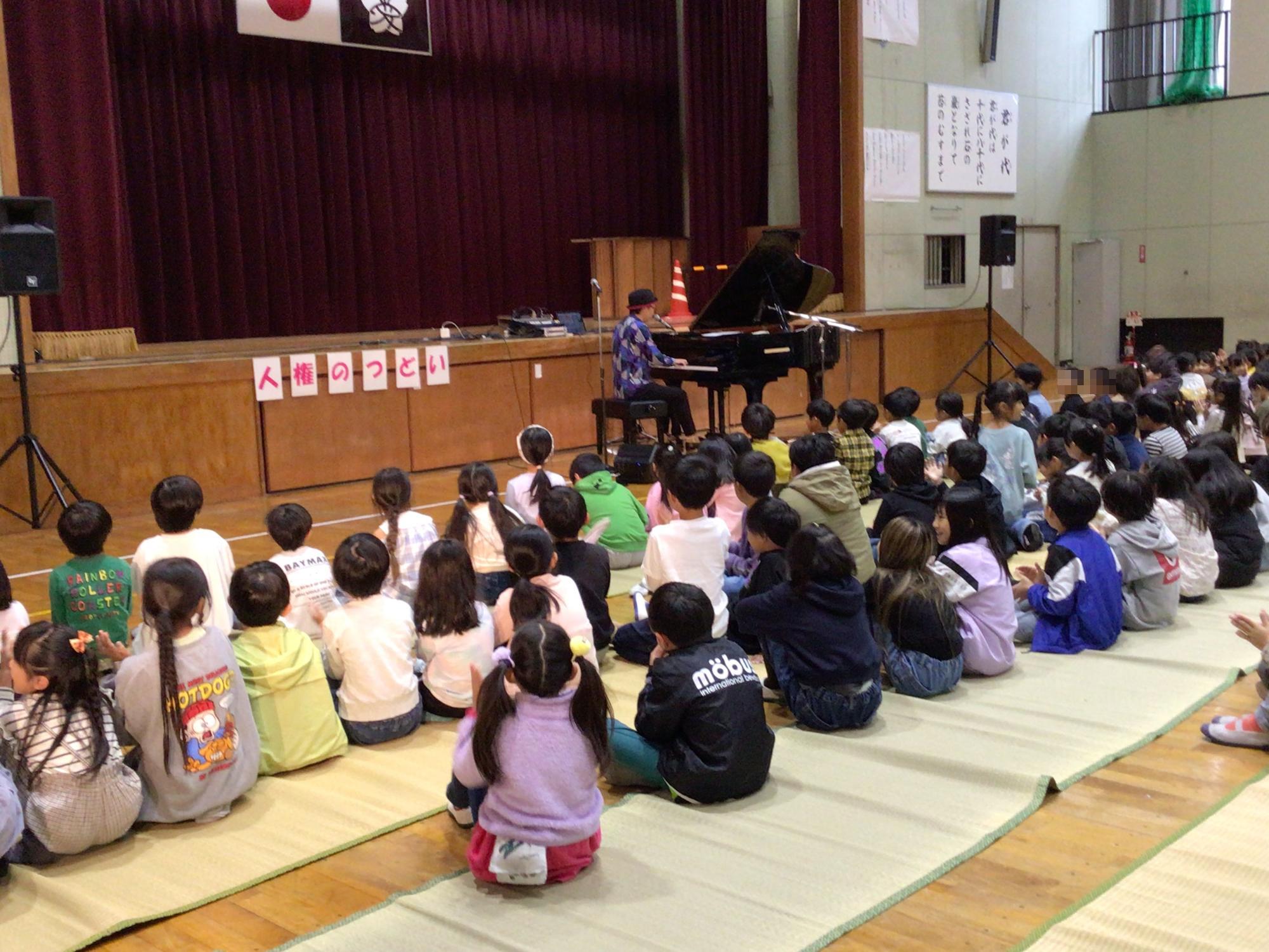 人権週間のまとめとして、愛知川小学校のテーマソングを作ってくださった岡田健太郎さんをお招きして、人権コンサートを開きました。アップテンポの曲に合わせて、全校でリズム遊びをしたりボディパーカッションをしたりしてみんなで楽しみました。最後は、岡田さんが作詞作曲をした「生まれてきてくれてありがとう」というメッセージを込めた曲を弾き語りしてくださいました。