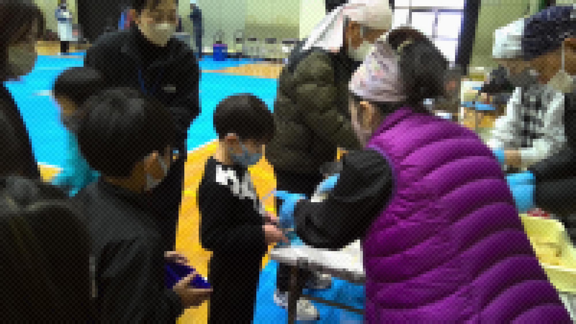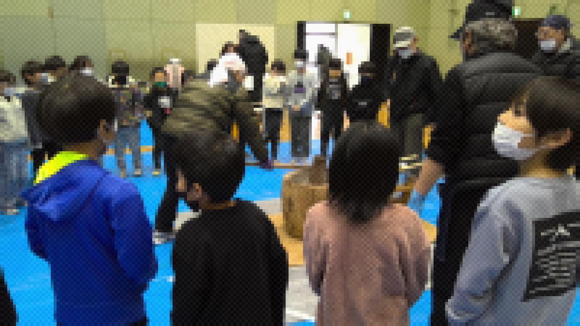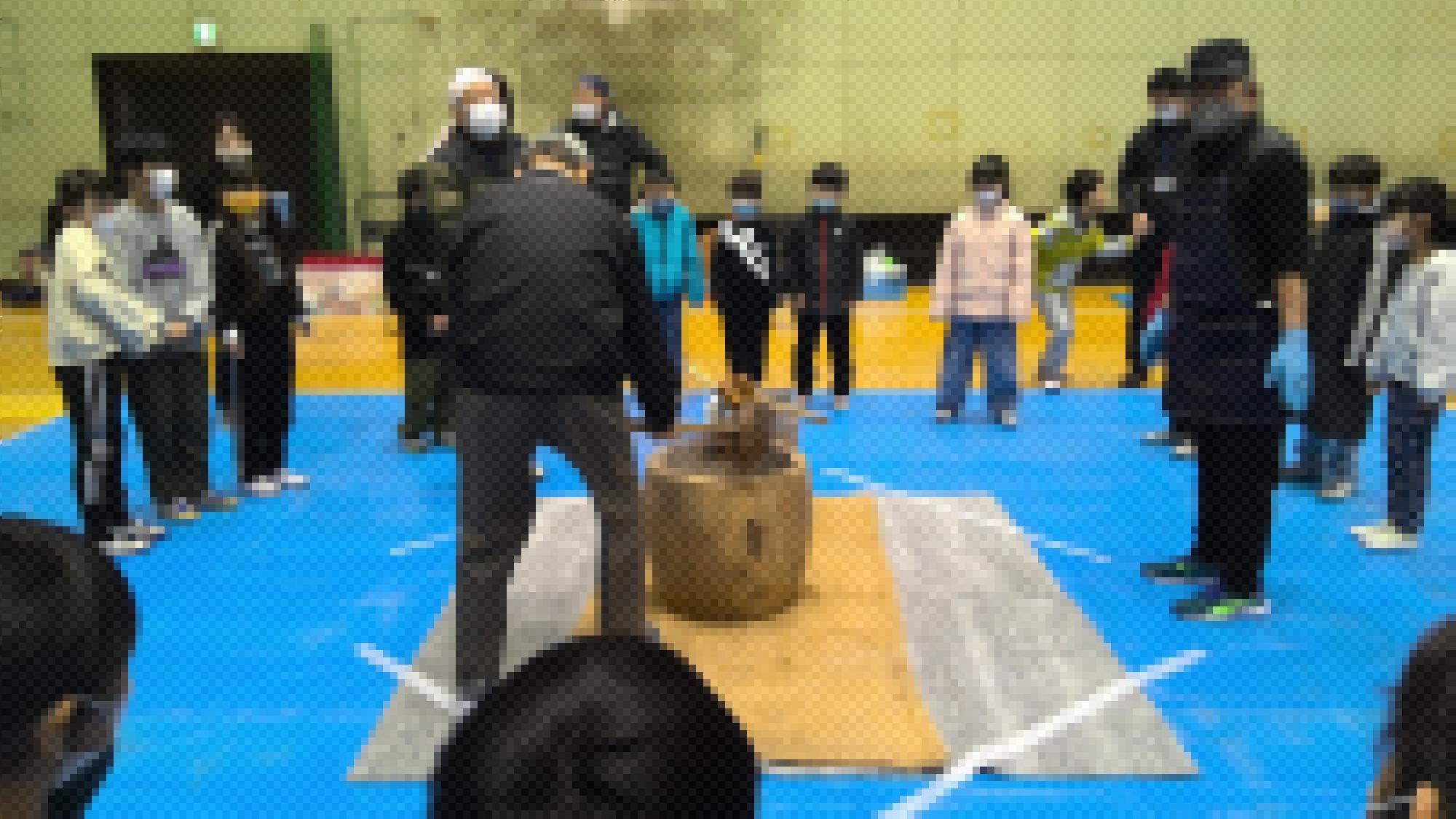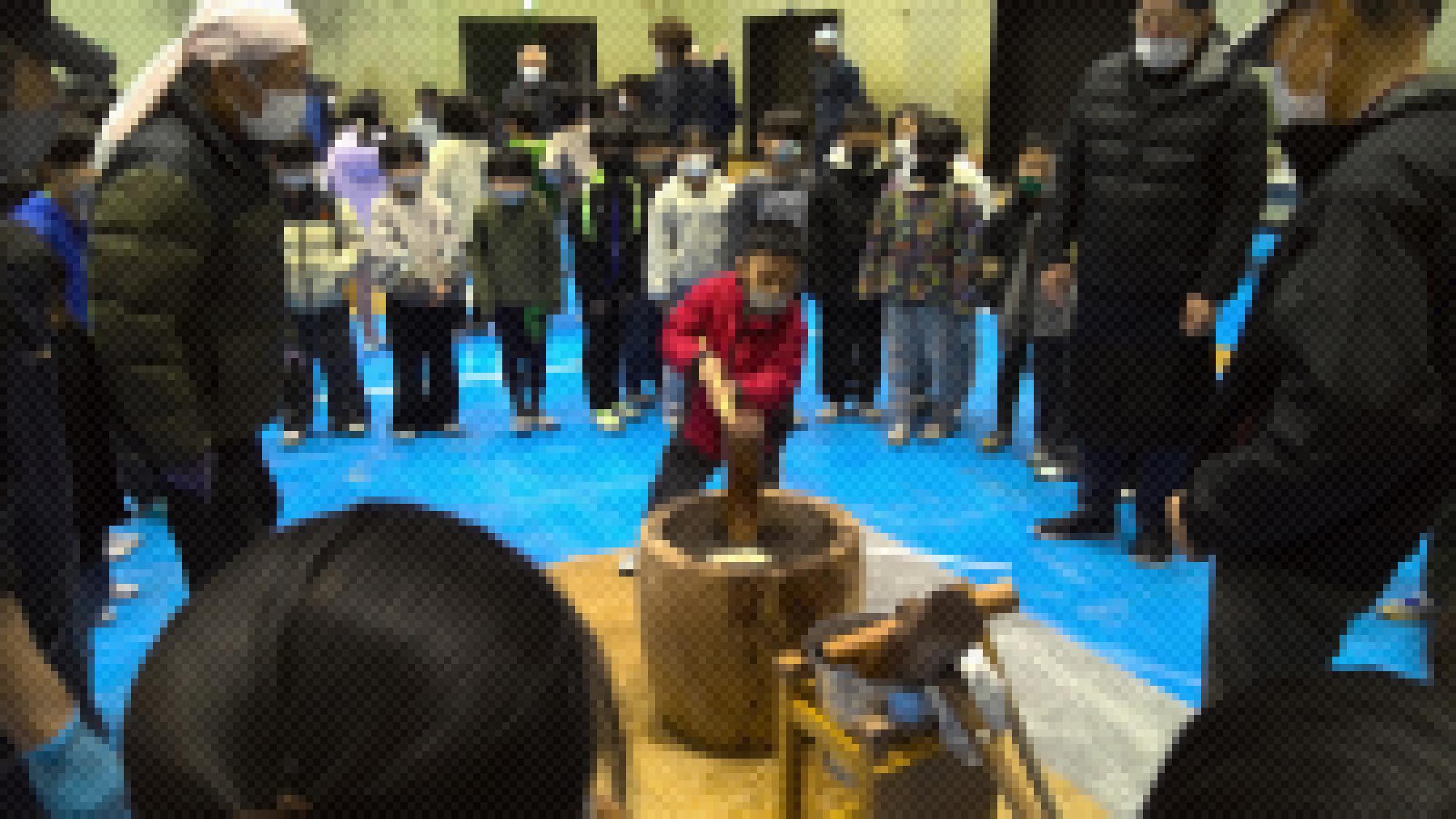 地域の方がもちつきをしてくださる力強い音に、「よいしょ!」という掛け声が上がったり、もちをつく真似をする姿が見られたり、体育館いっぱいに笑顔が広がりました。いざ、自分たちがもちつきを行う番になると、予想以上の杵の重さに驚く姿が見られましたが、地域の方の協力を得ながら、学級の友だちと力を合わせてもちをつきあげました。
