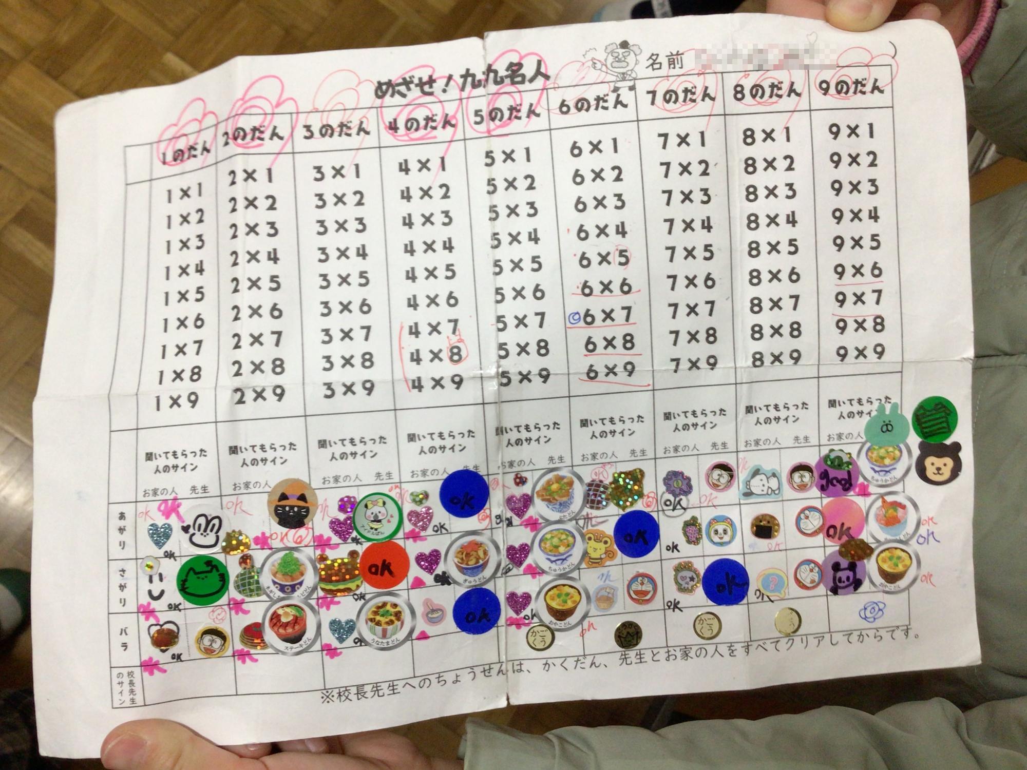 2年生は、かけ算九九「めざせ!九九名人」に取り組んでいます。家でも学校でも何度も何度も唱えて、覚えるように頑張っています。