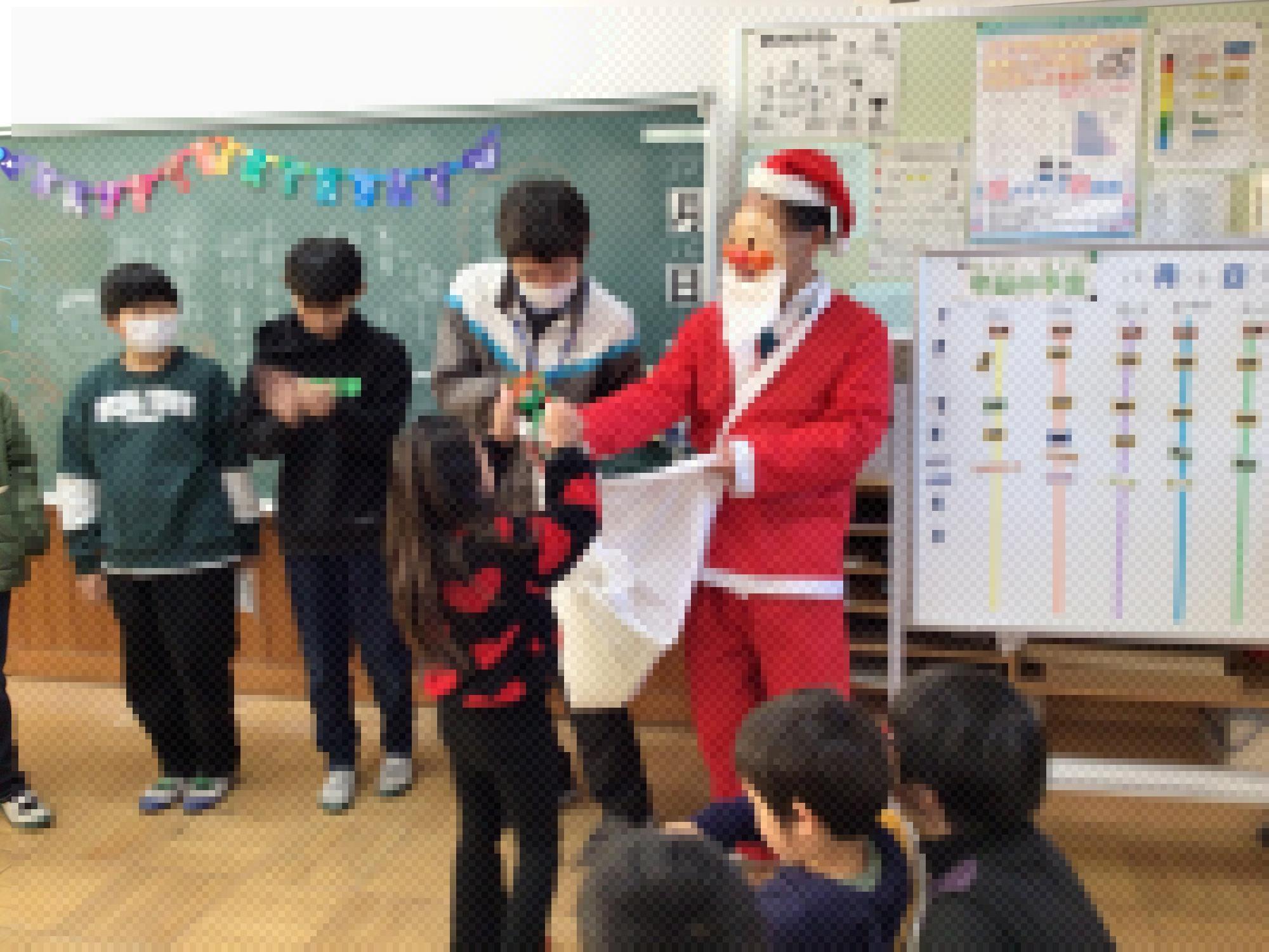 今日は、すずかけ学級をのぞくと、クリスマス会を楽しんでいました。サンタクロースが登場して、子どもたち一人ひとりに「プレゼント」を渡してくれました。大喜びの子どもたちでした。また、1年生や2年生は、学年でドッチボールとしたり、カロムをしたりしてみんなで楽しんでいました。