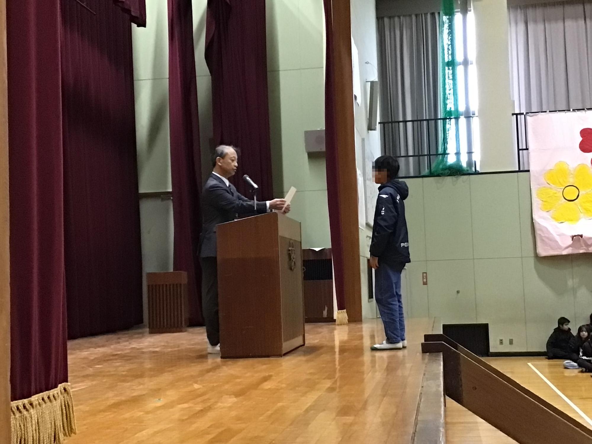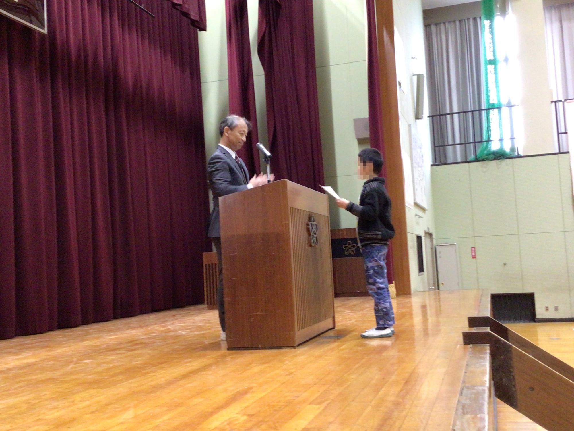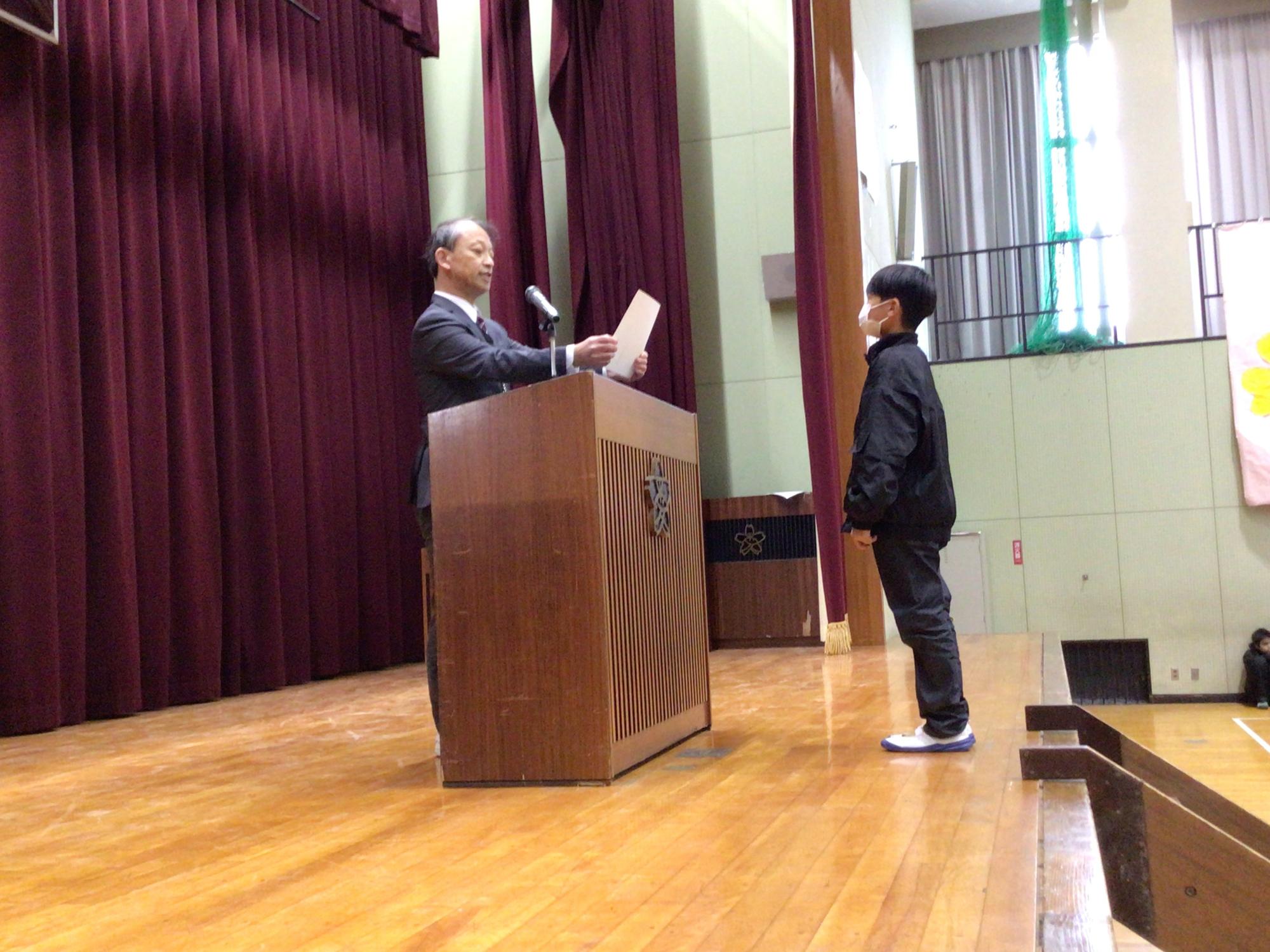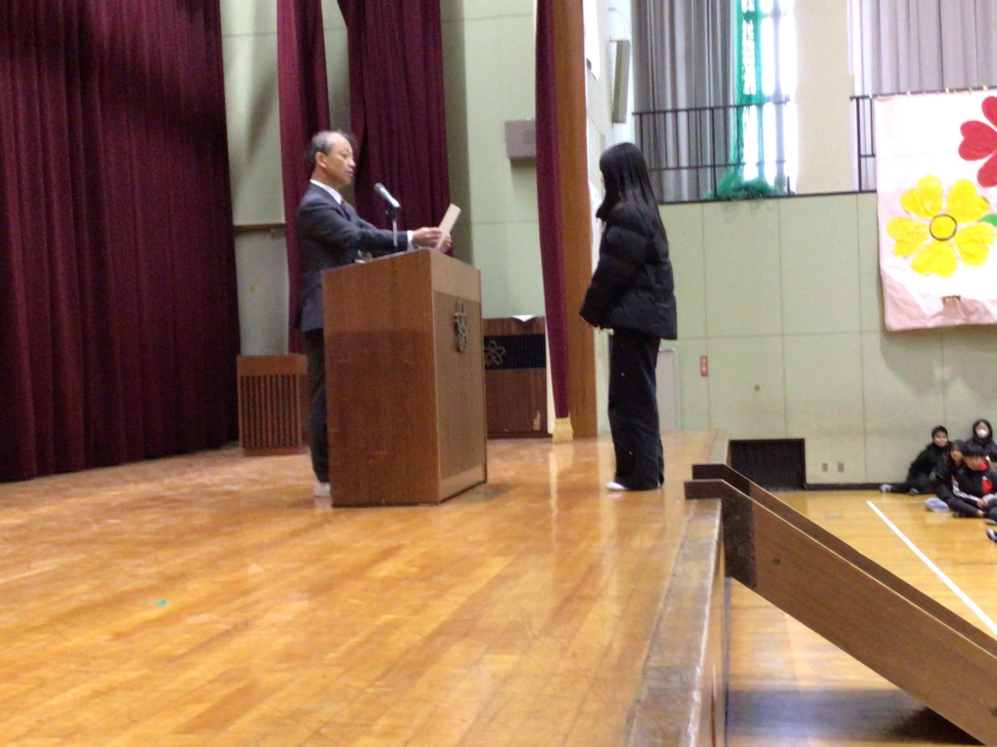 2学期の終業式が行われました。校長先生は、長い2学期をふりかえり、子どもたちが頑張っていた姿をいっぱい褒めてくださいました。その後、各学年の児童代表が2学期を振り返ってがんばったことや3学期に頑張りたいこと等を発表しました。また、「持久走チャレンジ大会」と「自主勉チャレンジウィーク」の入賞者の表彰も行われました。