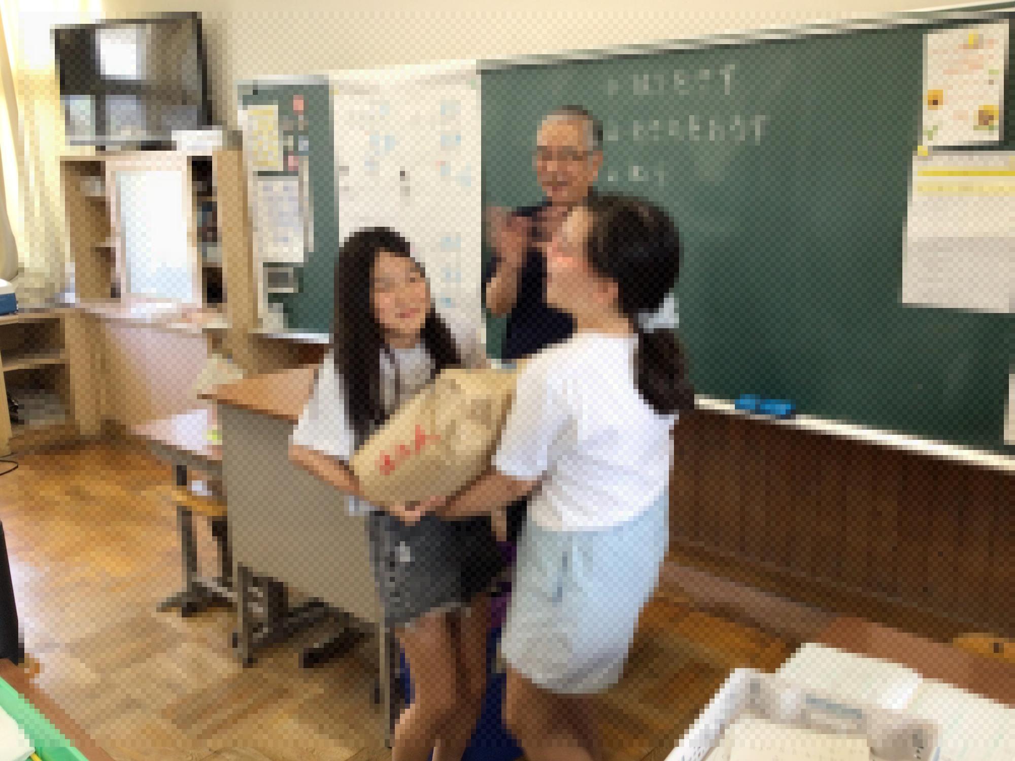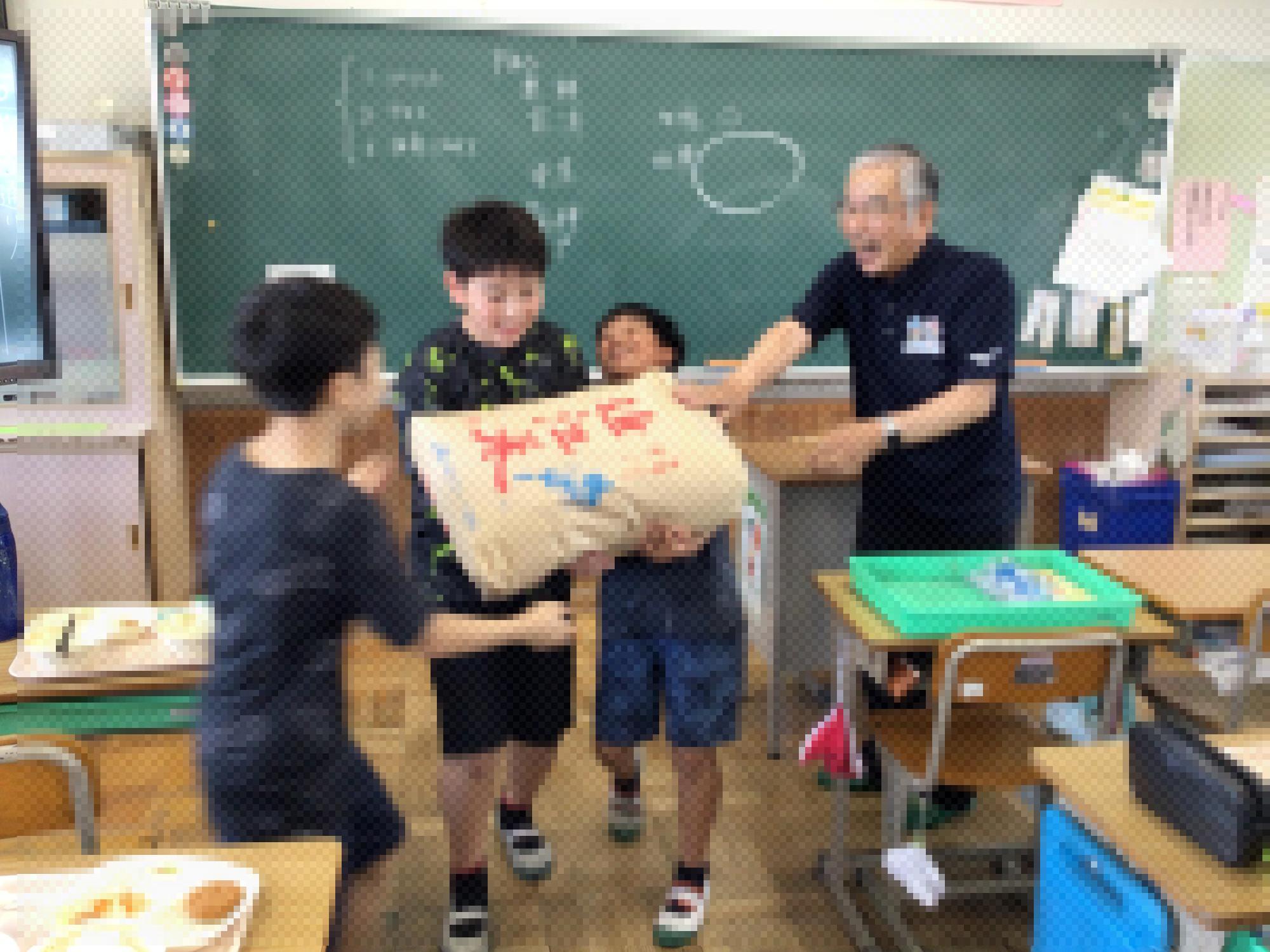 「たんぼの子」で稲刈り体験をさせていただいた「ドリームアグリ沓掛」の方が、玄米を届けてくださいました。各学級1袋30キロずつ、子どもたちは、2、3人がかりで持ち上げていました。今後は届けていただいたお米を精米して、家庭科の調理実習等でいただきます。