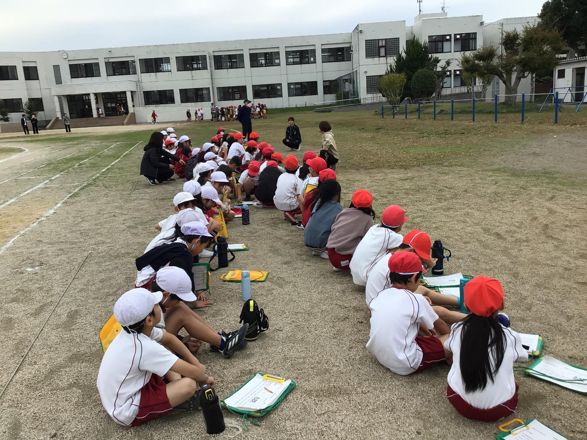 穏やかな小春日和の中、持久走チャレンジ大会が行われました。低学年は3分間、中学年は4分間、高学年は5分間、決められた時間の中で、どれだけ長い距離を走れるか挑戦しました。走った後は、みんな「やりきったという」清々しい顔をしていました。