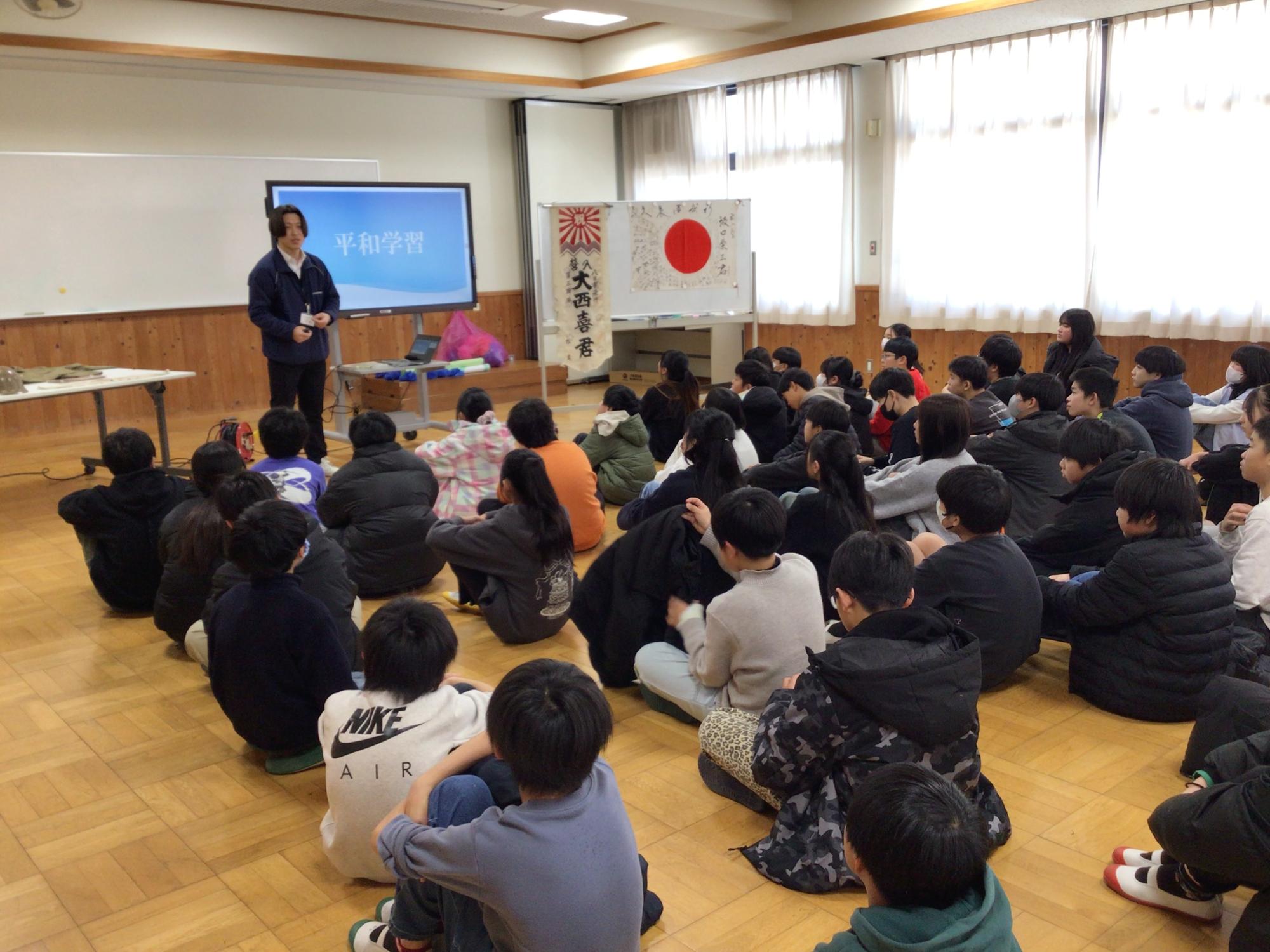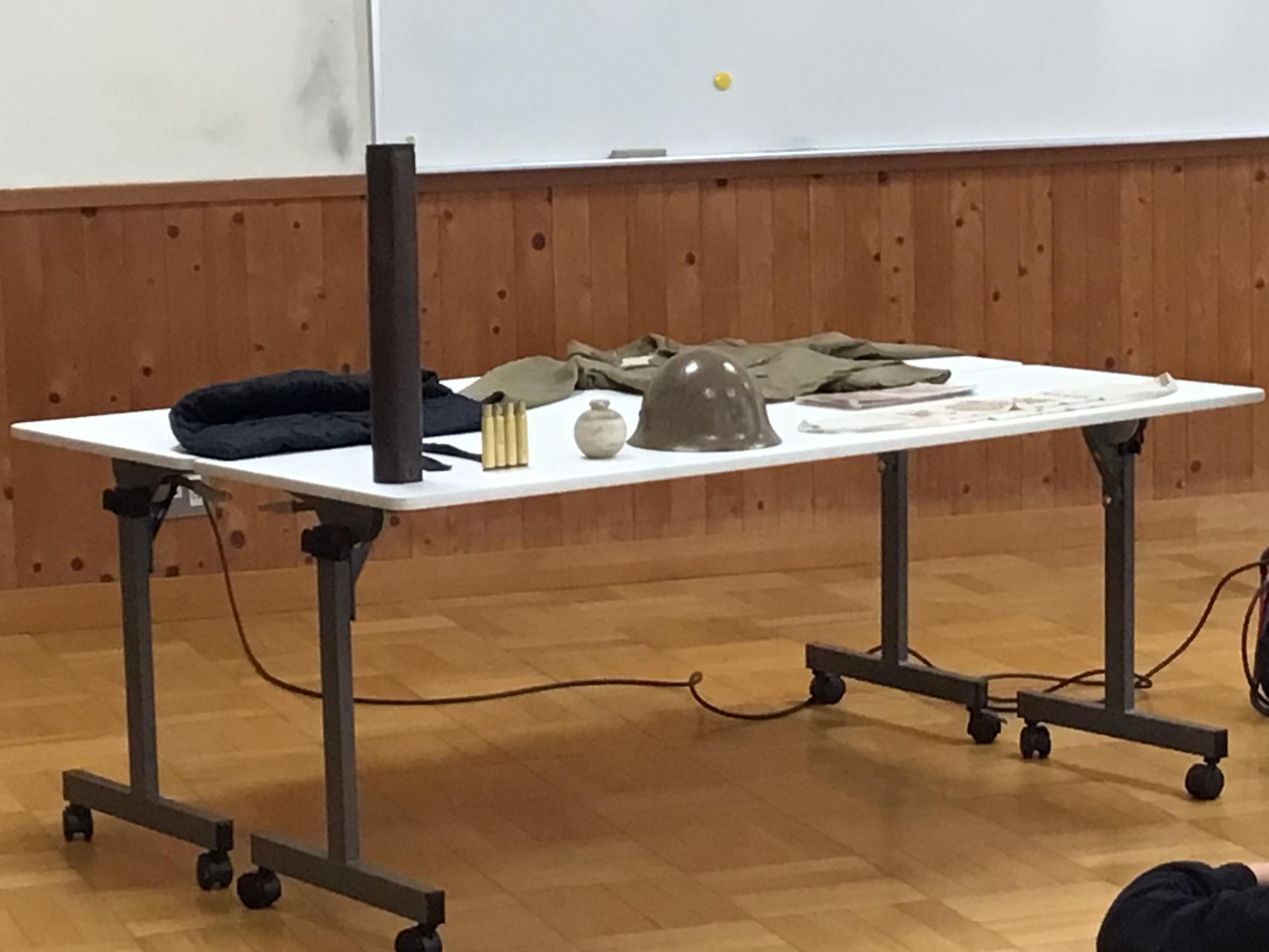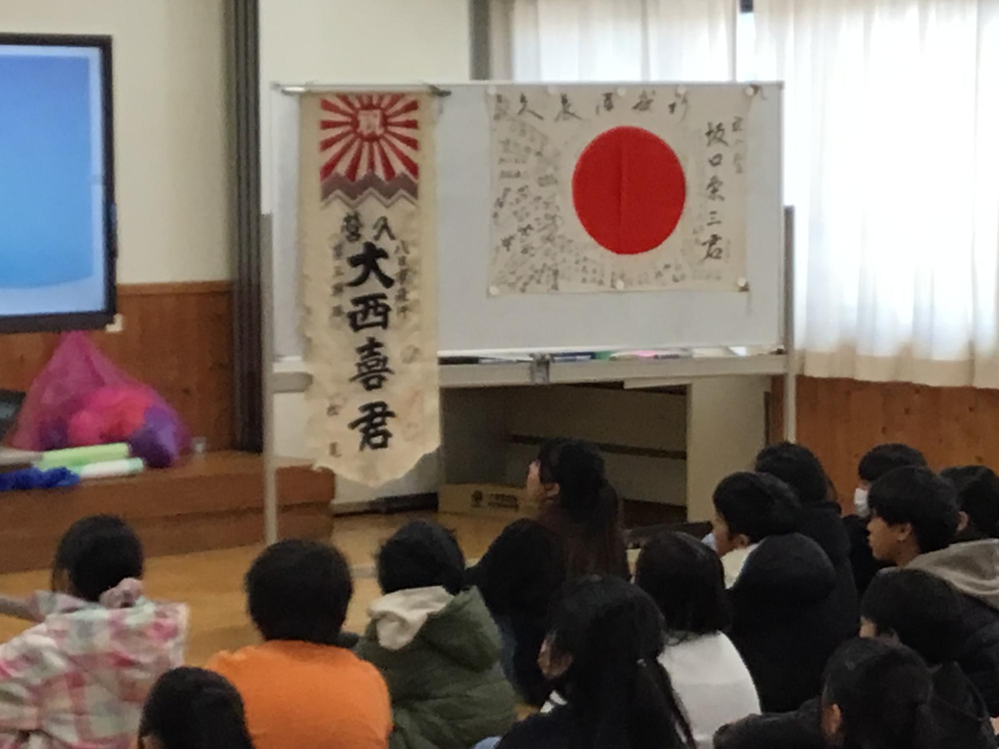 「平和祈念館」の方をゲストティーチャーとしてお迎えして、平和学習を行いました。講師の先生は、戦争当時に実際に使われていたヘルメットや爆弾の筒、日の丸の旗等の貴重な資料を見せながら、戦争時代の人々のくらしや戦争の恐ろしさなどを教えてくださいました。