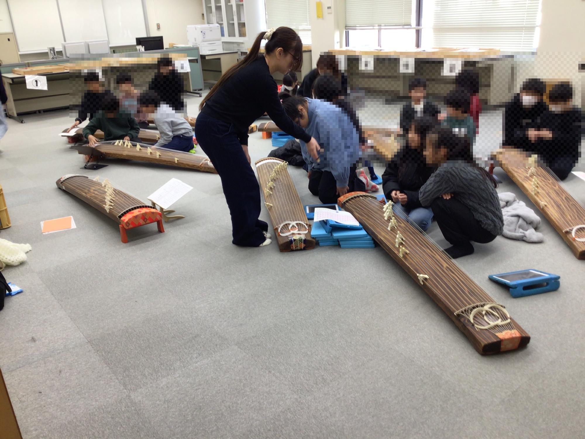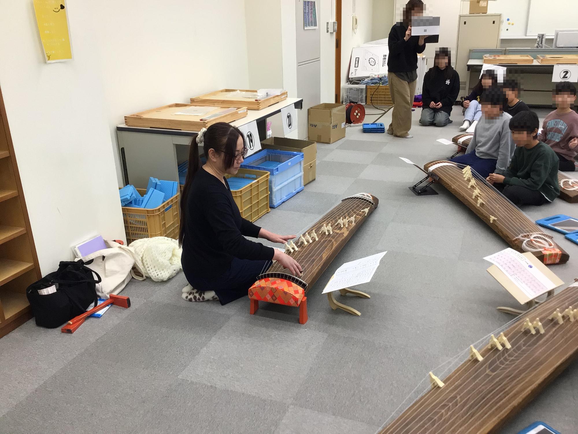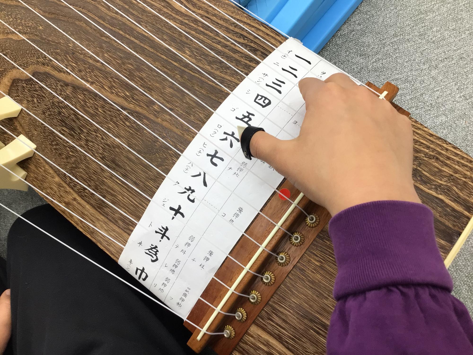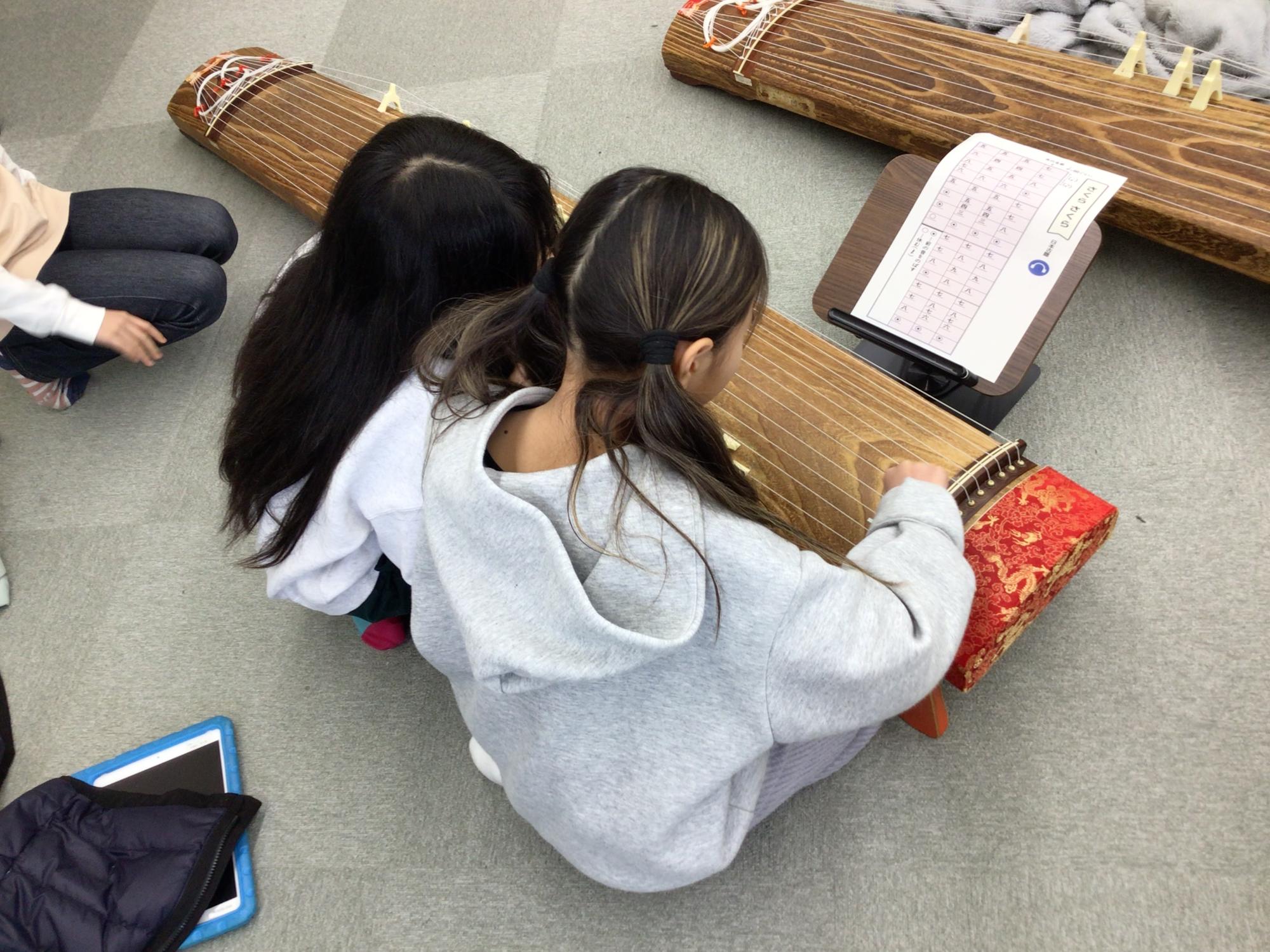 「本物の琴を触るのは、はじめて!」という児童が多く、「つめ」をつけたり弦をはじいたりとみんな興味津々で体験を楽しんでいました。最後は、先生に教えていただいた「さくら さくら」をみんなで演奏しました。