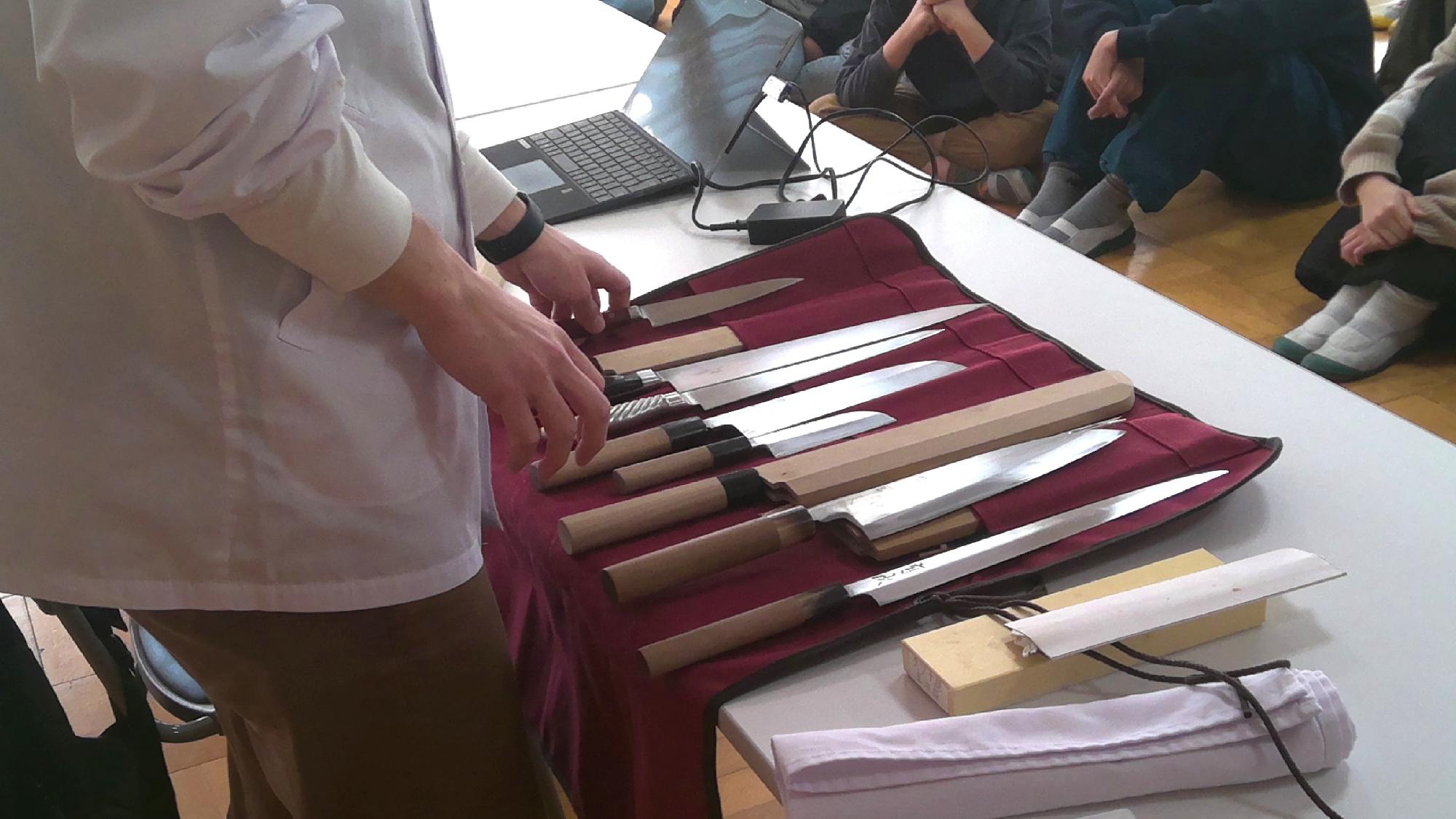 自己紹介の後、お店や料理の写真をスライドで見せてくださいました。また、料理で実際に使っているたくさんの包丁を見せてくださり、用途用途で使い分けていることや何年も手入れをして大切に使っていること等を教えてくださいました。