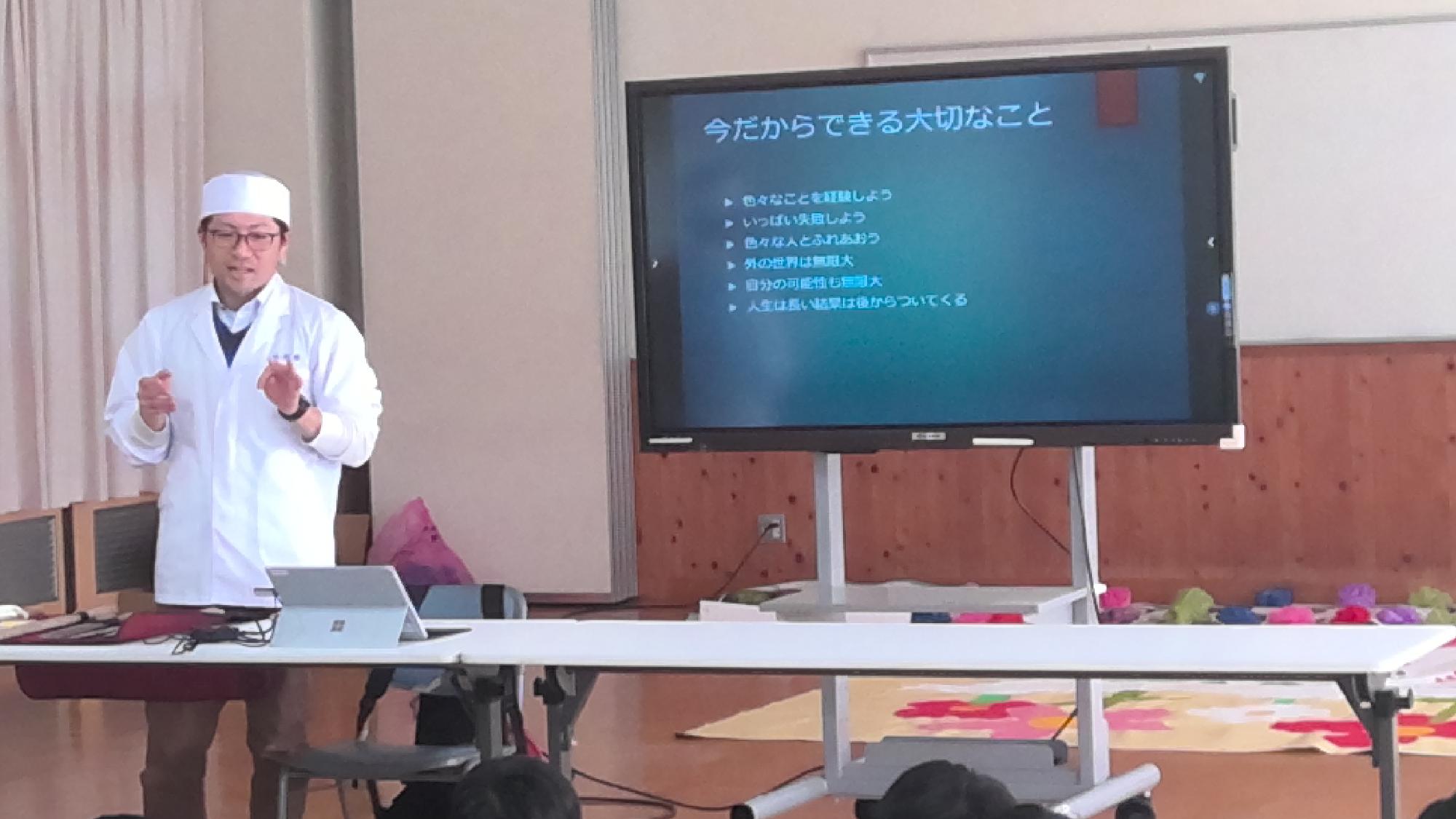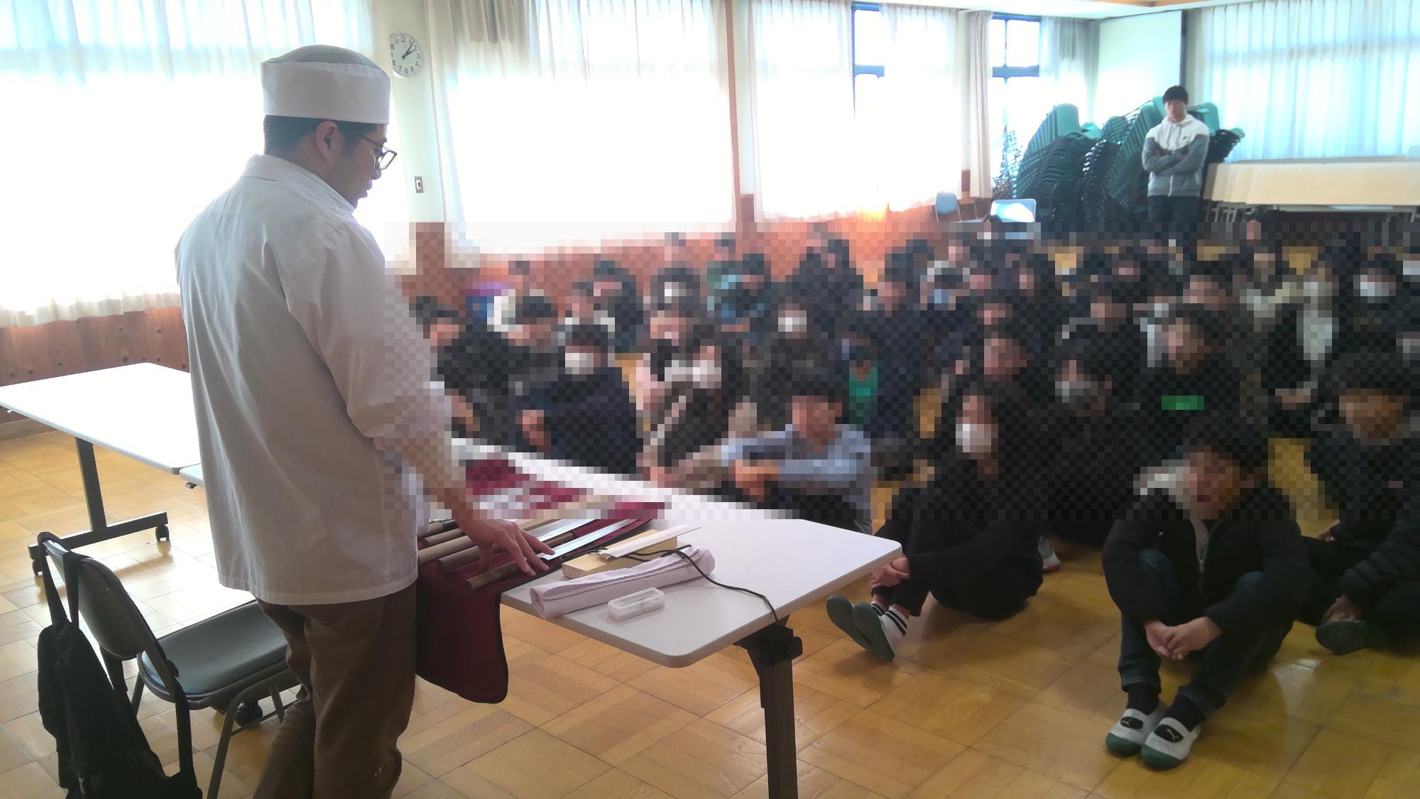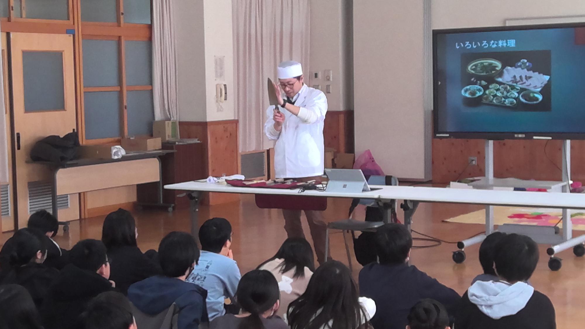 6年生はキャリア教育「ようこそ先輩」授業として、地域の「竹平楼」さんから料理人の方をお招きしてお話を聞かせていただきました。