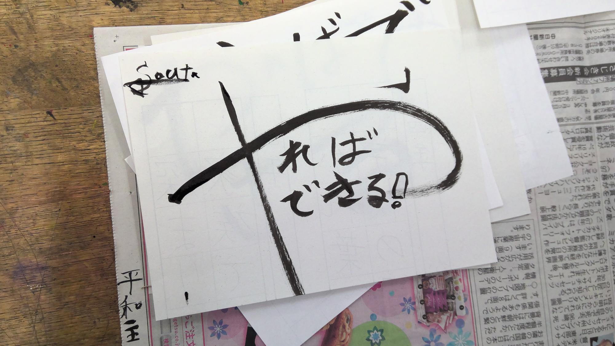 筆文字アートでは、まさみんさんに教えていただきながら、「好きな言葉」「好きな歌の歌詞」等を筆で綴りました。