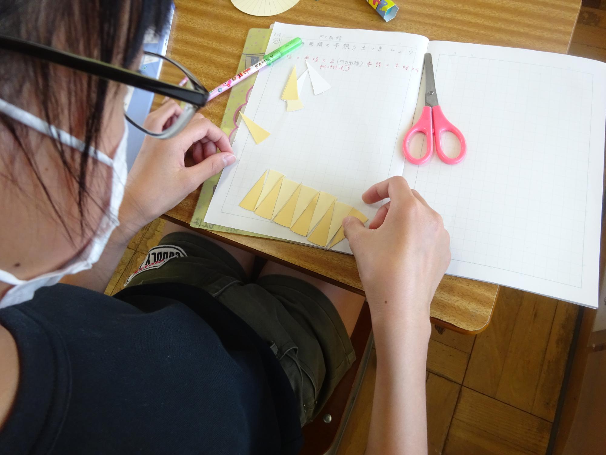 6年生の算数科では、今、円の面積について学んでいます。今日は、円の面積の求め方について、みんなで考えました。授業の中で、円の面積を変えずに、形を変えると面積が求めやすくなることを知り、子供たちも早速、円を切り、切ったものを敷き詰めて、既に面積公式を学習している平行四辺形に変形させて、およその面積を求めることができました。このように、算数的な活動を通して、量感を養い、面積公式ができるまでの過程を追体験することで、公式は単なる暗記ではなく、納得の中で便利さが実感できるものとなります。次の時間にいよいよ円の面積について学習します。お楽しみに!