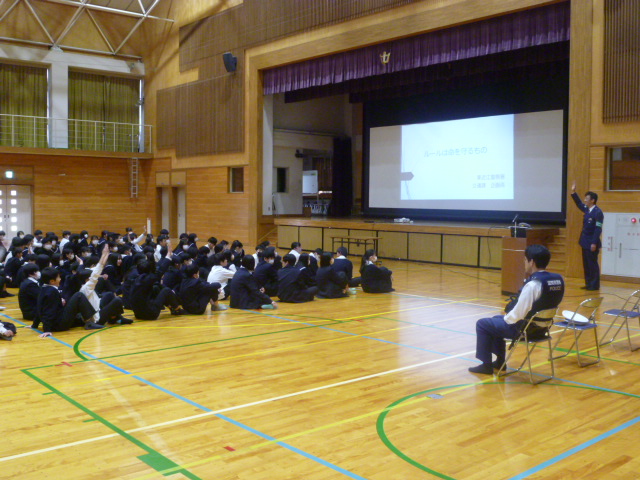 東近江警察署生活安全課の方から、SNSにかかわる内容を中心として、非行防止についてお話を聞きました。