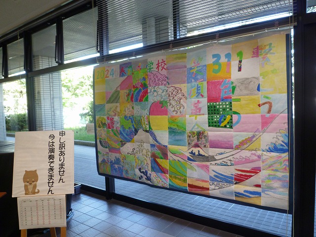 美術の授業で制作した生徒の作品を玄関ホールに展示してます。