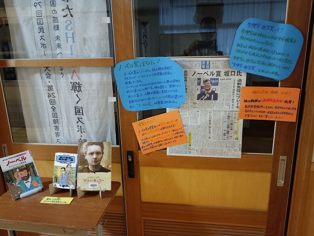 滋賀県(長浜市)出身の坂口氏がノーベル賞を受賞されたことを記念して、図書室の一角にコーナーを学校司書さんが設定しました。