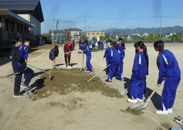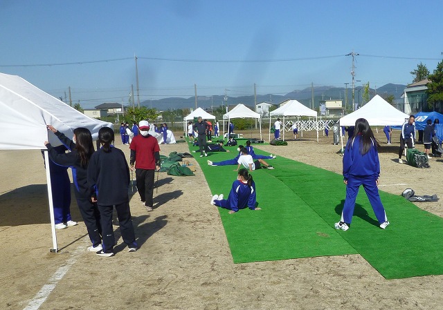 委員会の生徒と生徒会本部を中心に準備を行いました。砂を返したりグランドを整備したり、応援席を設置したりと大活躍でした。先日まで行われていた国スポで使用されていた人工芝が学校に届いたので、今年は応援席に敷き詰めてみました。