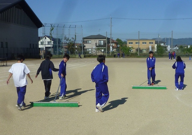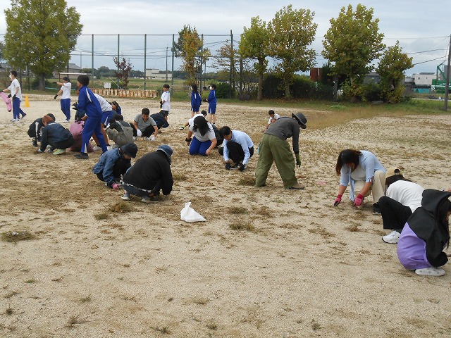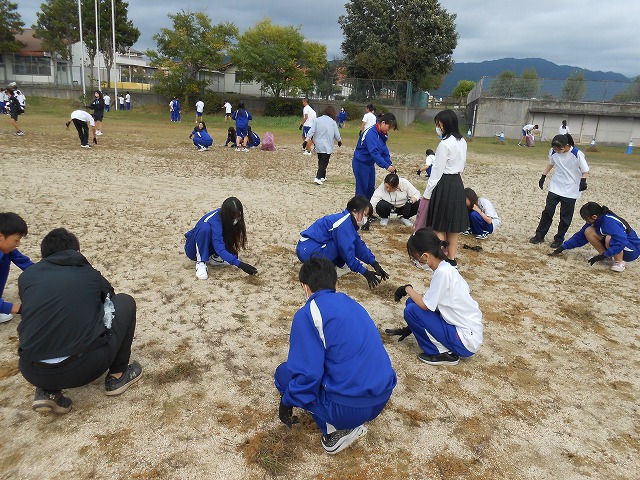 体育大会当日とその練習が、少しでも環境の良い中で行いたい!と生徒会が呼びかけました。その熱い思いにこたえ、委員会で参加したり部活動で参加したり、または個人で参加したりと生徒が集まりました。同時に生徒会が保護者さんや地域へもメールで呼びかけたことで、多くの方が集まってくださいました。