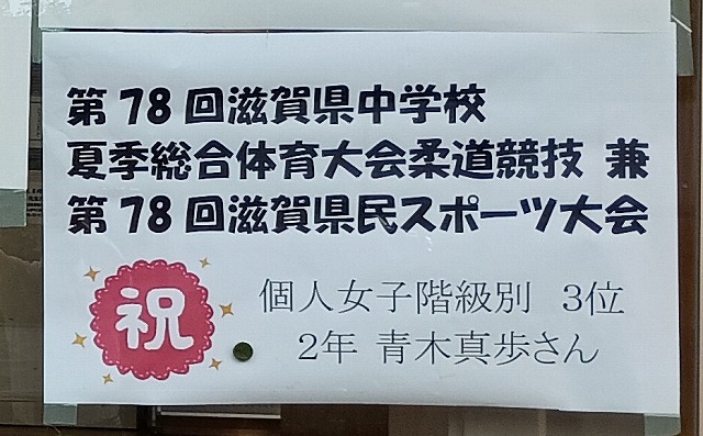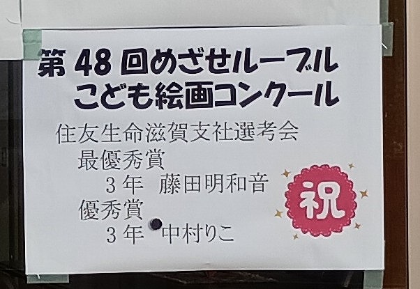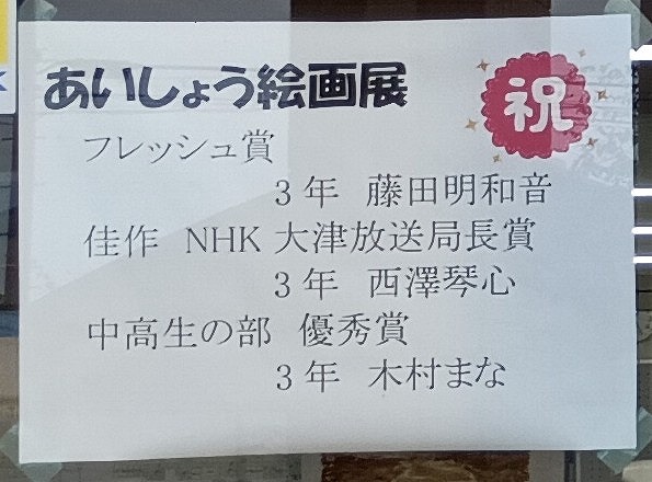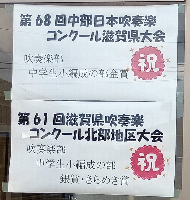 運動に文化、芸術と様々な分野で活躍している団体や個人が校内にいます。その結果を玄関の窓に張り出して結果を祝福しています。本当によく頑張っていますね。