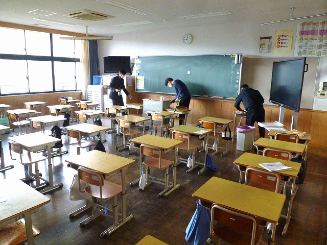 生徒のいない静かな教室で、職員が消毒作業をしました。