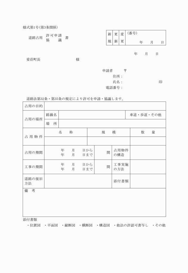 第3条 道路を占用しようとするときは、道路占用許可申請書(様式第1号)を町長に提出し、許可を受けなければならない。占用の許可を受けた後、占用の目的、方法または施設を変更しようとするときも、同様とする。