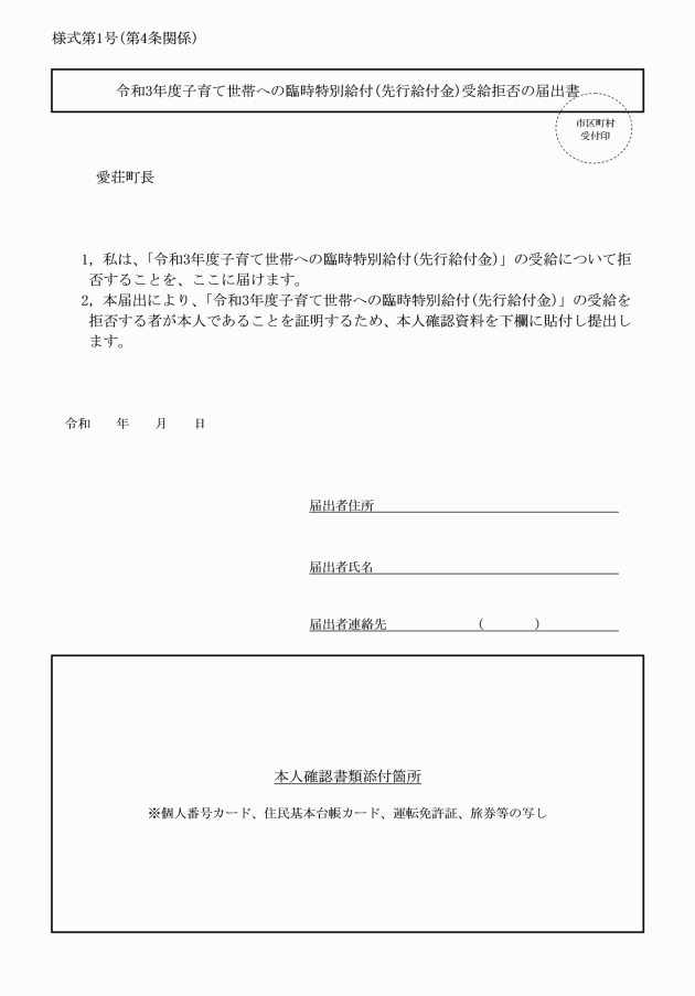 2 一般支給対象者は、前項の申込みを受けた際、子育て世帯等臨時特別支援事業(先行給付金)の受給の拒否を届け出ることができる。