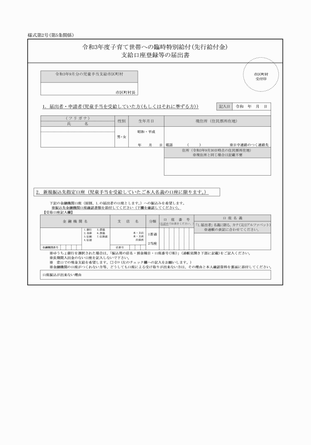 2 前項の規定により支給対象者に対して支給する子育て世帯等臨時特別支援事業(先行給付金)の金額は、対象児童1人につき50,000円とする。
