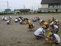 ![]() 一列に並びで苗植え ボランティアの方々 田植えボランティアの方の指導のもと「日本晴」の苗を丁寧に植えました。5年児童たちにとって手で植える初めての体験でした。これから世話をし、秋の収穫が楽しみです。 |