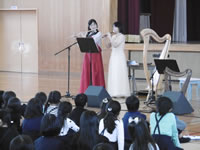 ![]() 4年生が「びわ湖ホール声楽アンサンブル」の方に来ていただき、ふれあい音楽教室を行いました。声楽アンサンブルの方2名とピアニストの方1名に来ていただき、校歌や童謡などを聴かせていただいたあと、「ゆかいに歩けば」の歌唱指導をしていただきました。 |