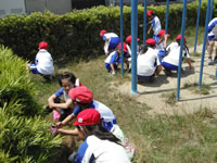 7月1日の「びわ湖の日」にちなんで、全校愛校活動として運動場やその周辺の除草作業を行いました。色別縦割り班に分かれて、それぞれの分担場所をきれいにしようとがんばっていました。 |