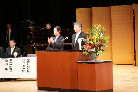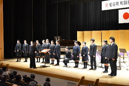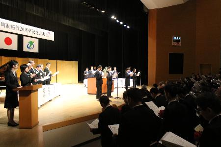 秦荘中学校の代表生徒、愛知中学校の代表生徒による町民憲章唱和。会場の皆さまも一緒に唱和しました。