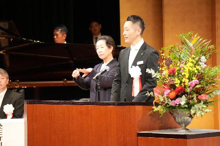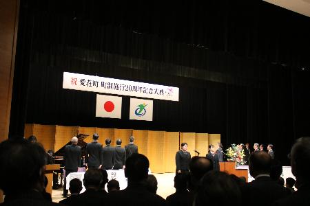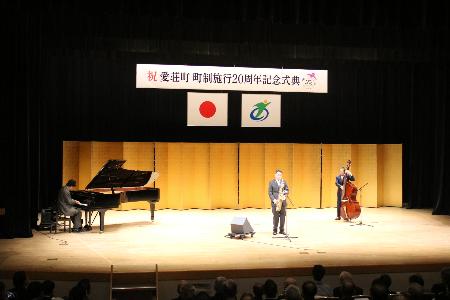 記念式典では、ジャズの生演奏や記念動画上映、特別感謝状贈呈、名誉町民表彰などを行い、約300名の参加者と愛荘町町制施行20周年を祝福しました。
