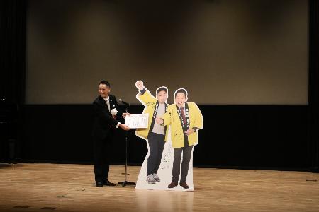 お笑い芸人 ダイアン のお二人に本町初となる名誉町民表彰を行いました。あいにく、式典への出席は叶いませんでしたが、会場ではダイアンのコメント動画を放映し、「ゴイゴイスー」をいただきました。