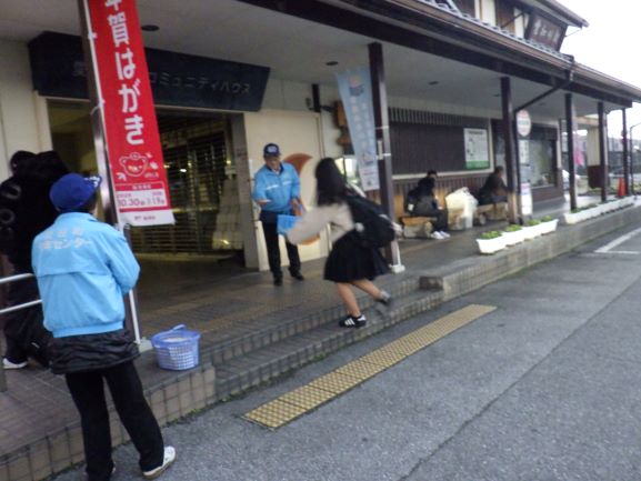愛知川駅にて挨拶運動と声掛けの様子