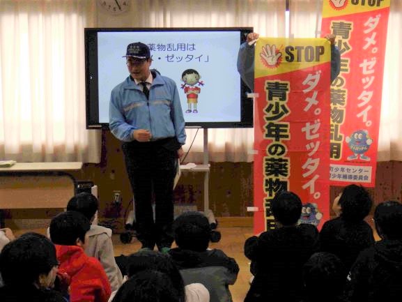 少年センター職員、少年補導委員も啓発研修の一環として、教室に同席させていただき、啓発活動も実施させていただきました。教室の最後に時間をいただき、薬物乱用は「ダメ。ゼッタイ。」の啓発活動を行いました。「顔の見える活動」を進めています。