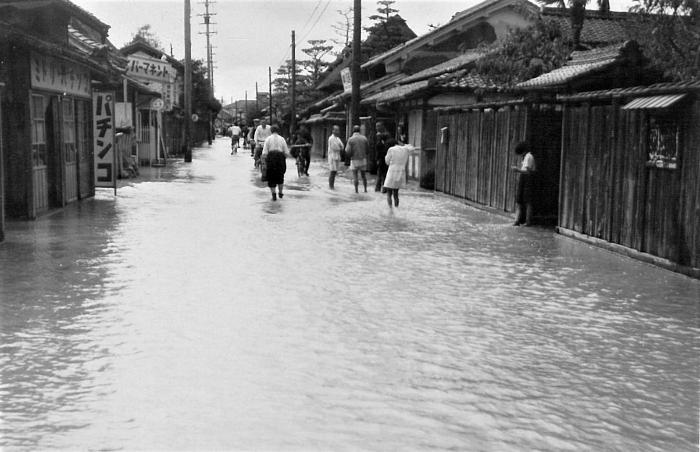 愛荘町域は近世・近代を通じて度々水害に見舞われ、戦後の土地・河川改良事業までそれは続きました。昭和28年(1953年)9月25日、台風13号により愛知川の堤防が決壊し、旧・愛知川町では四百戸以上が床上浸水被害を受けます。写真で川のように見える中山道は、国道8号線開通前まで町の幹線道路でした。写真左にはパチンコ店やパーマ屋の看板が見え、往時の賑わいも伺えます。